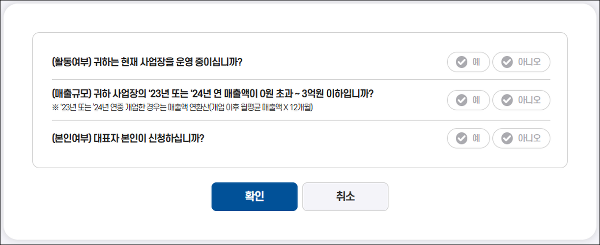 - 동일인이 운영하는 다수 사업체 중 1개만 신청 가능 (개인, 법인 구분 없음)